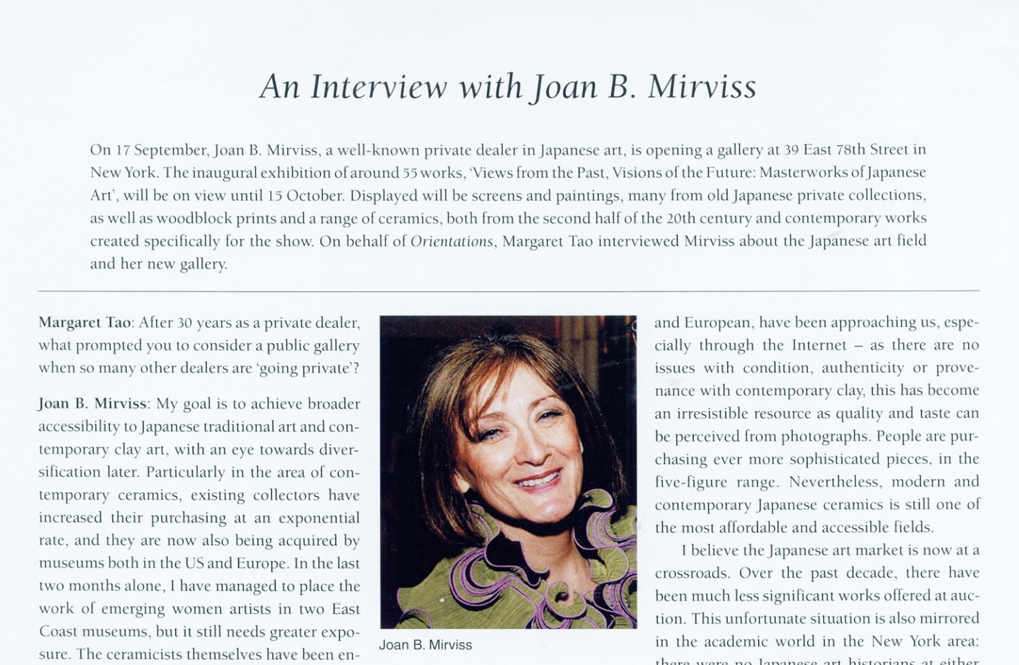 Joan B Mirviss: My goal is to achieve broader accessibility to Japanese traditional art and contemporary clay art, with an eye towards diversification later. Particularly in the area of contemporary ceramics, existing collectors have increased their purchasing at an exponential rate, and they are now also being acquired by museums both in the US and Europe. In the last two months alone, I have managed to place work of emerging women artists in two East Coast museums, but it still needs greater exposure. The ceramicists themselves have been encouraging me to open a gallery so as to have a good US venue that can exhibit their work in depth. I have maintained good relationships with many of them for decades, and feel a responsibility to move in this direction; if I don't, someone else will.