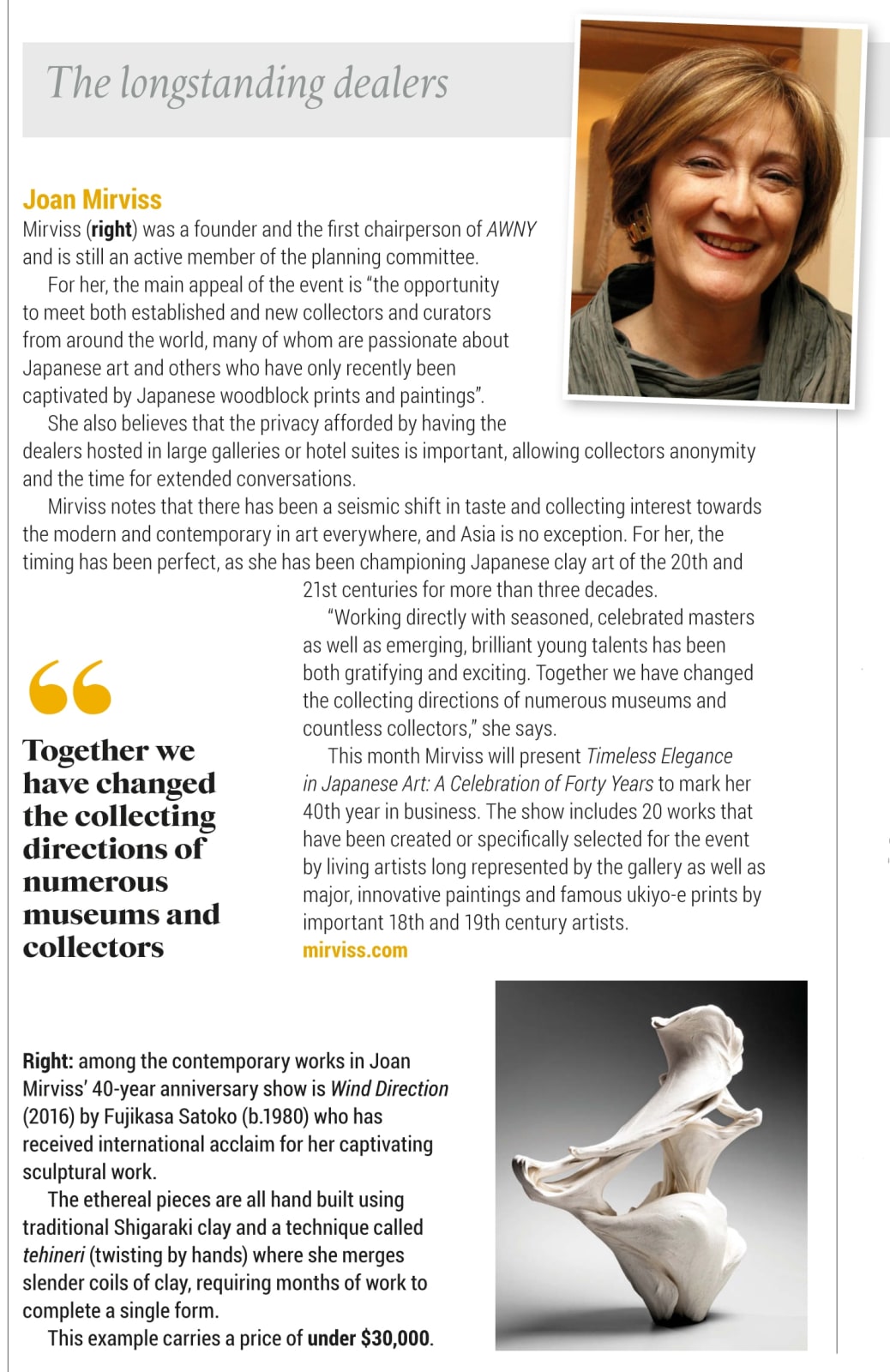 Mirviss notes that there has been a seismic shift in taste and collecting interest towards the modern and contemporary in art everywhere, and Asia is no exception. For her, the timing has been perfect, as she has been championing Japanese clay art of the 20th and 21st centuries for more than three decades.