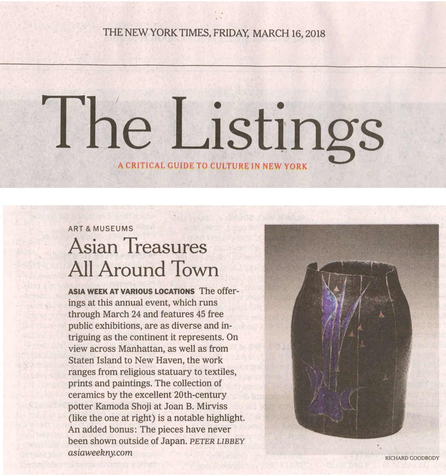 The offerings at this annual event, which runs through March 24 and features 45 free public exhibitions, are as diverse and intriguing as the continent it represents. On view across Manhattan, as well as from Staten Island to New Haven, the work ranges from religious statuary to textiles, prints and paintings. The collection of ceramics by the excellent 20th century potter Kamoda Shōji at Joan B. Mirviss (like the one at right) is a notable highlight. An added bonus: The pieces have never been shown outside of Japan.