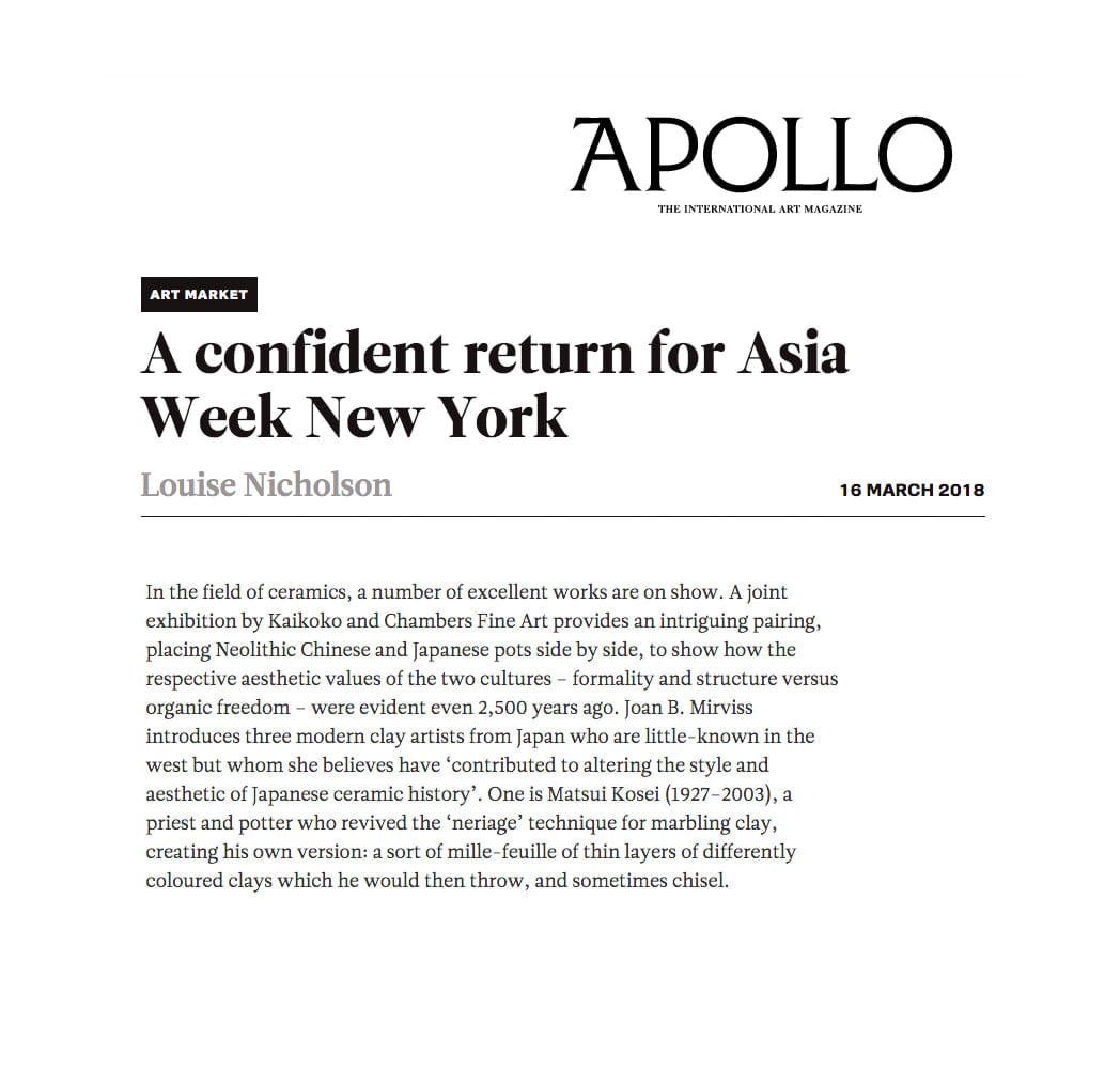 In the field of ceramics, a number of excellent works are on show. A joint exhibition by Kaikoko and Chambers Fine Art provides an intriguing pairing, placing Neolithic Chinese and Japanese pots side by side, to show how the respective aesthetic values of the two cultures - formality and strucure versus organic freedom - were evident even 2,500 years ago. Joan B Mirviss introduces three modern clay artists from Japan who are little-known in the west but whom she believes have 'contributed to altering the style and aesthetic of Japanese ceramic history'. One is Matsui Kosei (1927-2003), a priest and potter who revived the 'neriage' technique for marbling clay, creating his own version; a sort of mille-feuille of thin layers of differently coloured clays which he would then throw and sometimes chisel.