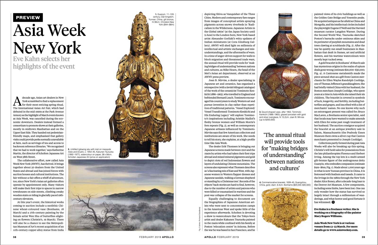 At this year’s event, the historical works coming to auction include a neolithic Chinese wheat-coloured vase (Bonhams, 18 March) and a 17th-century painting by the female artist Wen Shu of butterflies alighting on flowers (Christie’s, 19 March). There will also be a chance to see the Metropolitan Museum of Art’s recent acquisition of an 11th-century copper alloy statue from India depicting Shiva as Vanquisher of the Three Cities. Modern and contemporary fare ranges from images of conceptual artists spraying pigments across snowy riverbeds in ‘Radicalism in the Wilderness: Japanese Artists in the Global 1960s’ (at the Japan Society until 9 June) to the London-born, New York-based artist Alexander Gorlizki’s witty updates of Indian miniatures (at Cora Ginsburg Gallery). AWNY will shed light on millennia of intellectual and artistic exchanges and misunderstandings, and the aftermaths of wars. In a time of anger-driven support for walls to block migration and threatened trade wars, the annual ritual will provide tools for ‘making bridges of understanding’ between nations and cultures, as Mike Hearn, the head of the Met’s Asian art department, observed at an AWNY press preview.