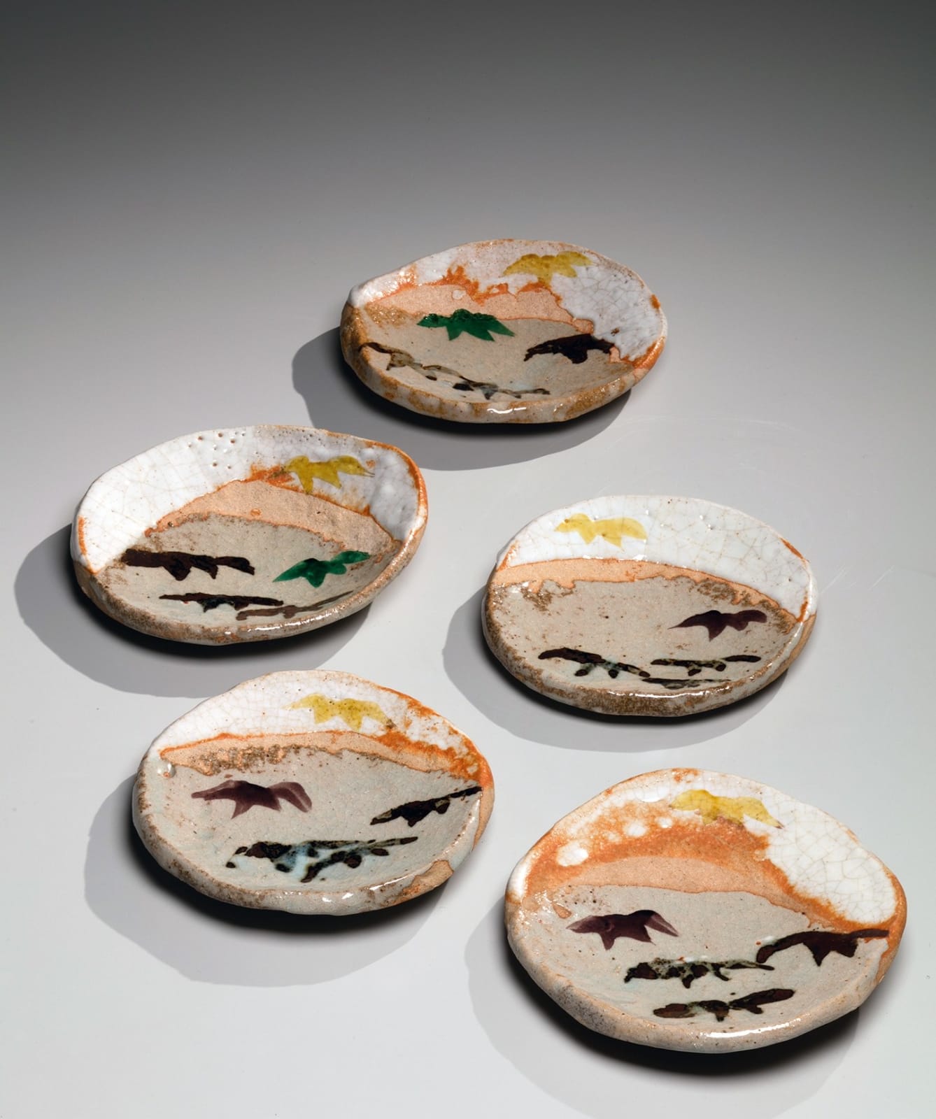 The polymathic Kitaoji Rosanjin (1893-1959) — widely known as Rosanjin — was arguably the greatest Japanese potter of the 20th century. He was also a painter, engraver, lacquer artist and a master of calligraphy, as well as an antiques dealer and restaurateur who served his guests on tableware he made himself. In 1954, he traveled to the United States for an exhibition of over 200 works at the Museum of Modern Art (which has seven in its collection) and then on to Europe where he met Picasso and Chagall. In 1955, he was selected in Japan to be a Living National Treasure for his mastery of Oribe ware. But he refused it, miffed that his former apprentice Arakawa Toyozo had already been so designated, for Shino ceramics.