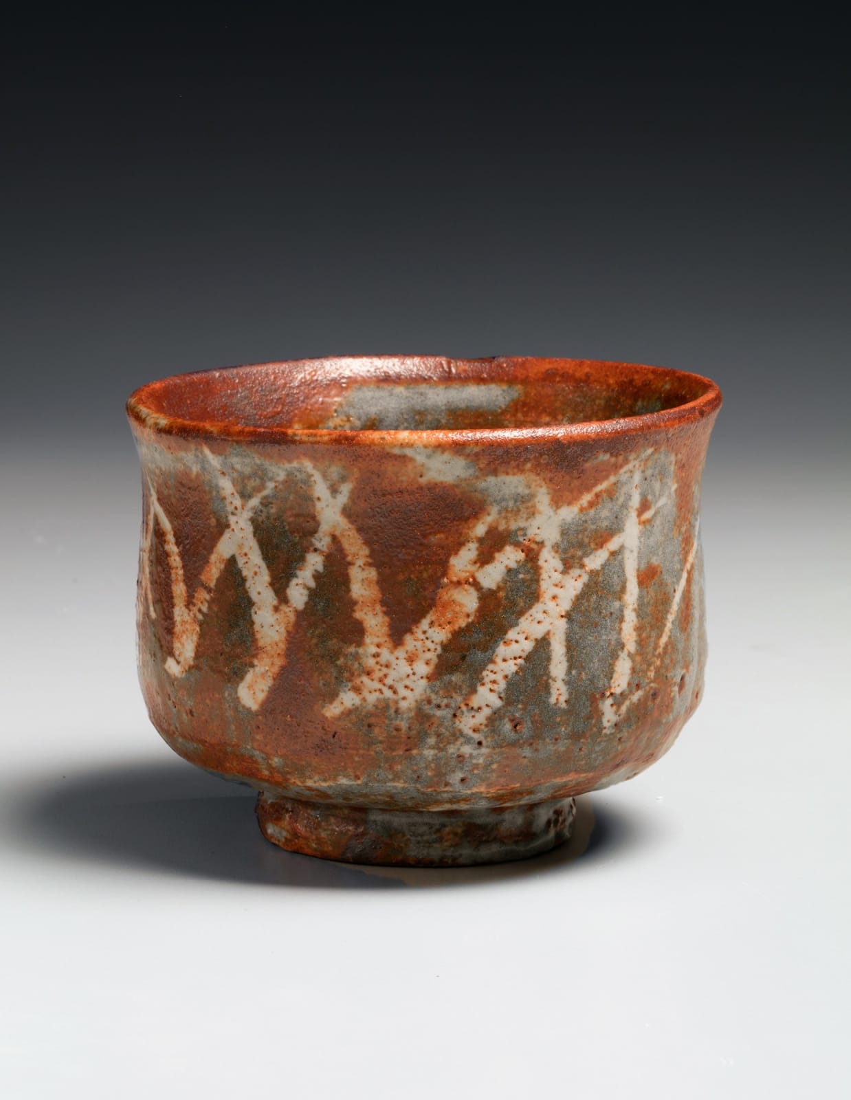 “Tradition Redefined: Rosanjin and his Rivals,” is thus an aptly titled exhibition. It presents some 30 works by the irascible artist and another 14 by six eminent potters with whom he maintained often prickly friendships. Together they helped bring the old styles of Japanese pottery into the 20th century, researching and experimenting with clays and glazes while ferreting out the ruins of ancient kiln sites for shards. Arakawa — the first to replicate such late 16th-century, Momoyama period styles as Oribe and Shino — is represented here by a classic Shino-type tea bowl, straight-sided, thick-walled, with a rounded lip and touches of iron oxide beneath a white glaze. Rosanjin’s version is comparatively anemic in form but flamboyant with the orange tones.