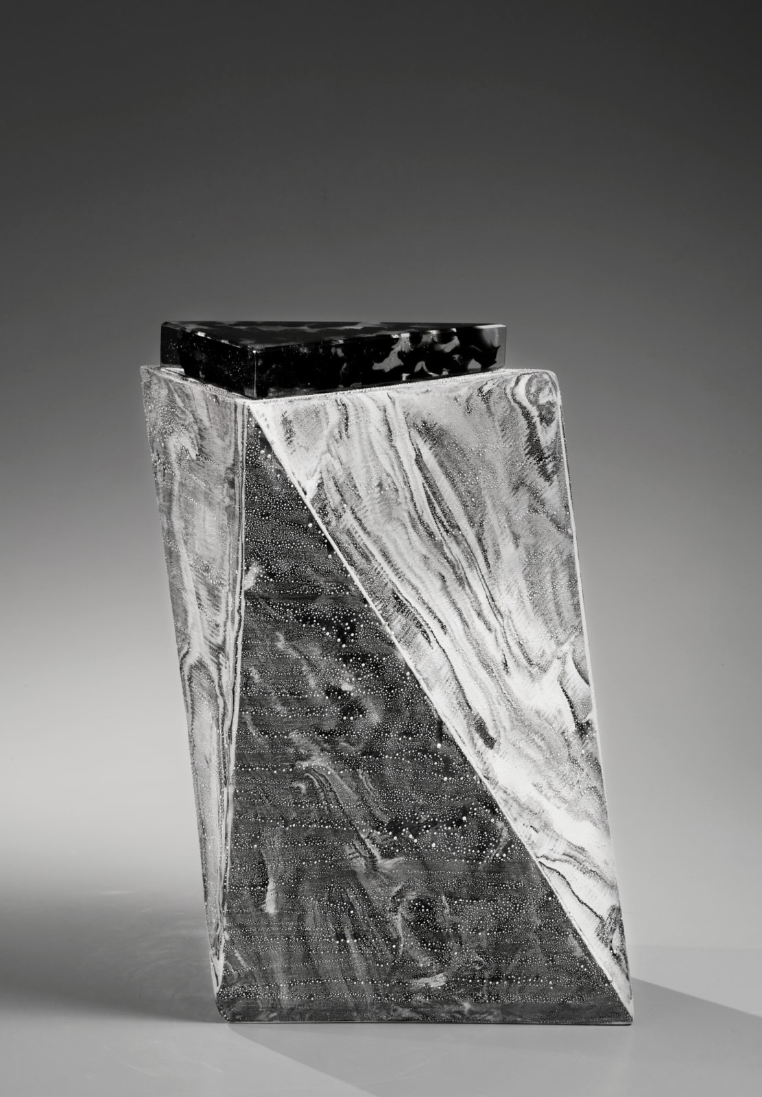 ArtDaily | NEW YORK, NY.- After six years of planning, acclaimed contemporary artist Kondō Takahiro presents his latest solo exhibition at Joan B Mirviss LTD this spring for Asia Week New York. These thirty new sculptures in swirling whirlpools of black, gray, and white marbleized porcelain glisten with 'silver mist' that resembles morning dew. His signature gintekisai (silver mist) overglaze technique finds new expression here as he plays with scale in striking geometric forms that catch light from daring angles. In a departure from his earlier "Wave" artworks, Kondō incorporates a whiter clay into his marbleization (nerikomi) technique. Its combination with the darker clay that seemingly flows down the surfaces creates an ink-on-paper effect, transforming his sculptures into what he calls "porcelain ink paintings". From major zig-zagging rhomboidal monoliths to glass capped vessels to wondrous teabowls, the incomparable skill and singular creativity of master artist Kondō Takahiro is on full display in MAKING WAVES.