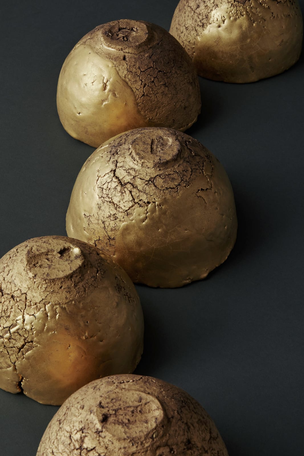 Junto a estos recipientes de gran tamaño, Ogawa Machiko presenta tazas de té cubiertas de esmalte metálico. Los cuencos, de textura rugosa y agrietada, brillan en oro o platino, que cuestionan aún más la identificación de estos recipientes de forma tradicional como tradicionales como apropiadas para el consumo de té.
