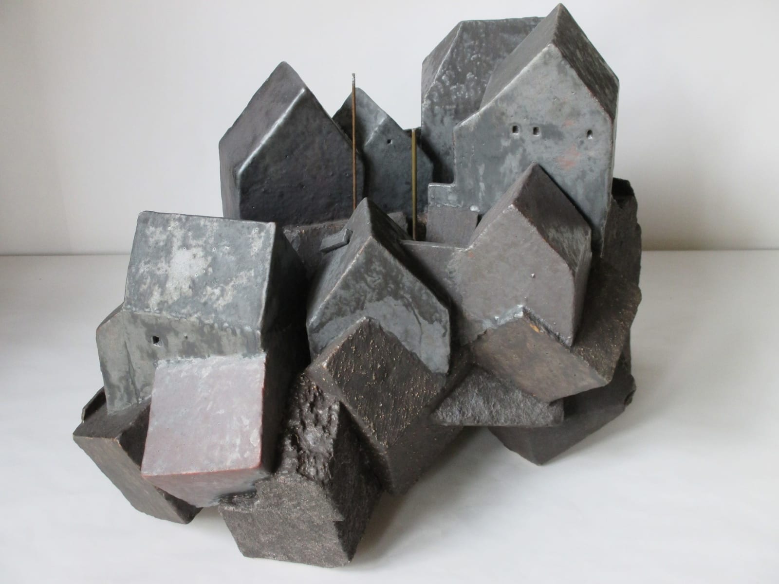 Rather than follow in the footsteps of his teachers and pursue polychrome enameling and patterning, Kawasaki chose instead to create entrancing architectural sculptures. His quietly powerful works resembled ancient homes, village scenes, or streets, but were abstracted geometrically to create evocations of those structures.
