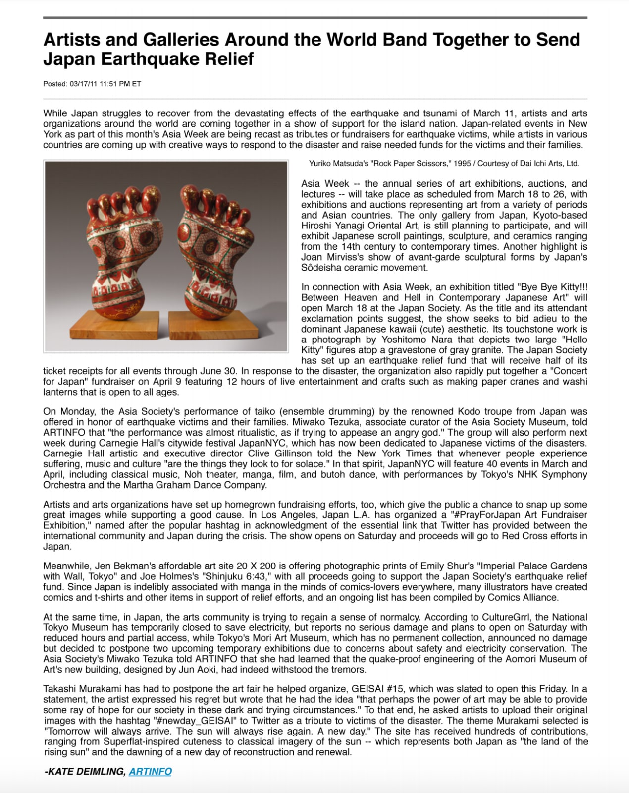 While Japan struggles to recover from the devastating effects of the earthquake and tsunami of March 11, artists and arts organizations around the world are coming together in a show of support for the island nation. Japan-related events in New York as part of this month's Asia Week are being recast as tributes or fundraisers for earthquake victims, while artists in various countries are coming up with creative ways to respond to the disaster and raise needed funds for the victims and their families.