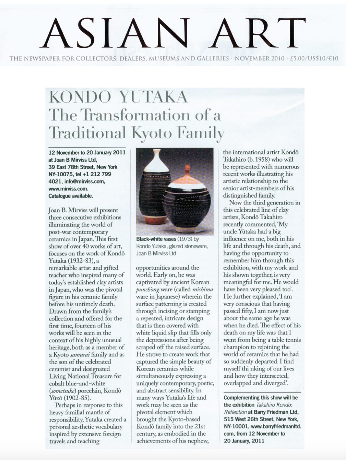 Joan B. Mirviss will present three consecutive exhibitions illuminating the world of post-war contemporary ceramics in Japan. This first show of over 40 works of art, focuses on the work of Kondô Yutaka (1932-83), a remarkable artist and gifted teacher who inspired many of today's established clay artists in Japan, who was the pivotal figure in his ceramic family before his untimely death. Drawn from the family's collection and offered for the first time, fourteen of his works will be seen in the context of his highly unusual heritage, both as a member of a Kyoto samurai family and as the son of the celebrated ceramist and designated Living National Treasure for cobalt blue-and-white (sometsuke) porcelain, Kondô Yûzo (1902-85).