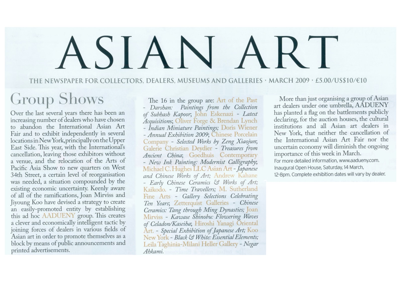 Keenly aware of all of the ramifications, Joan Mirviss and Jiyoung Koo have devised a strategy to create this ad hoc AADUENY group. This creates a clever and economically intelligent tactic by joining forces of dealers in various fields of Asian art in order to promote themselves as a block by means of public announcements and printed advertisements.