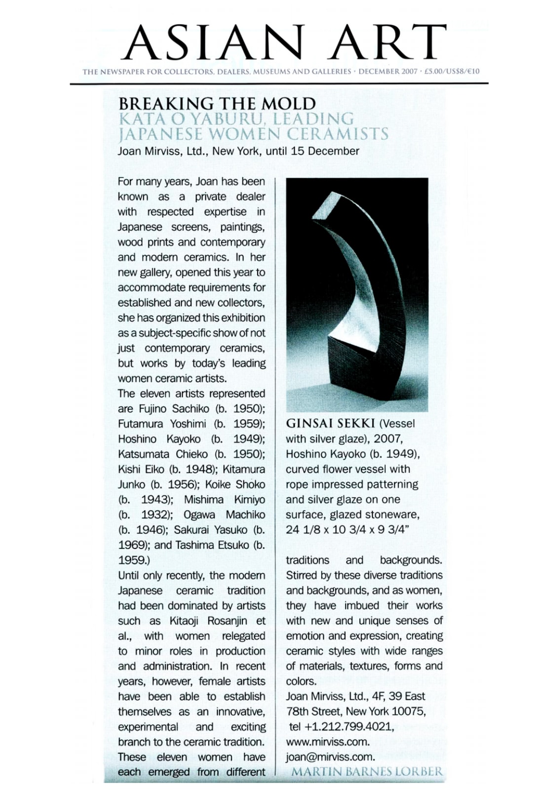 For many years, Joan has been known as a private dealer with respected expertise in Japanese screens, paintings, wood prints and contemporary and modern ceramics. In her new gallery, opened this year to accommodate requirements for established and new collectors, she has organized this exhibition as a subject-specific show of not just contemporary ceramics, but works by today's leading women ceramic artists.