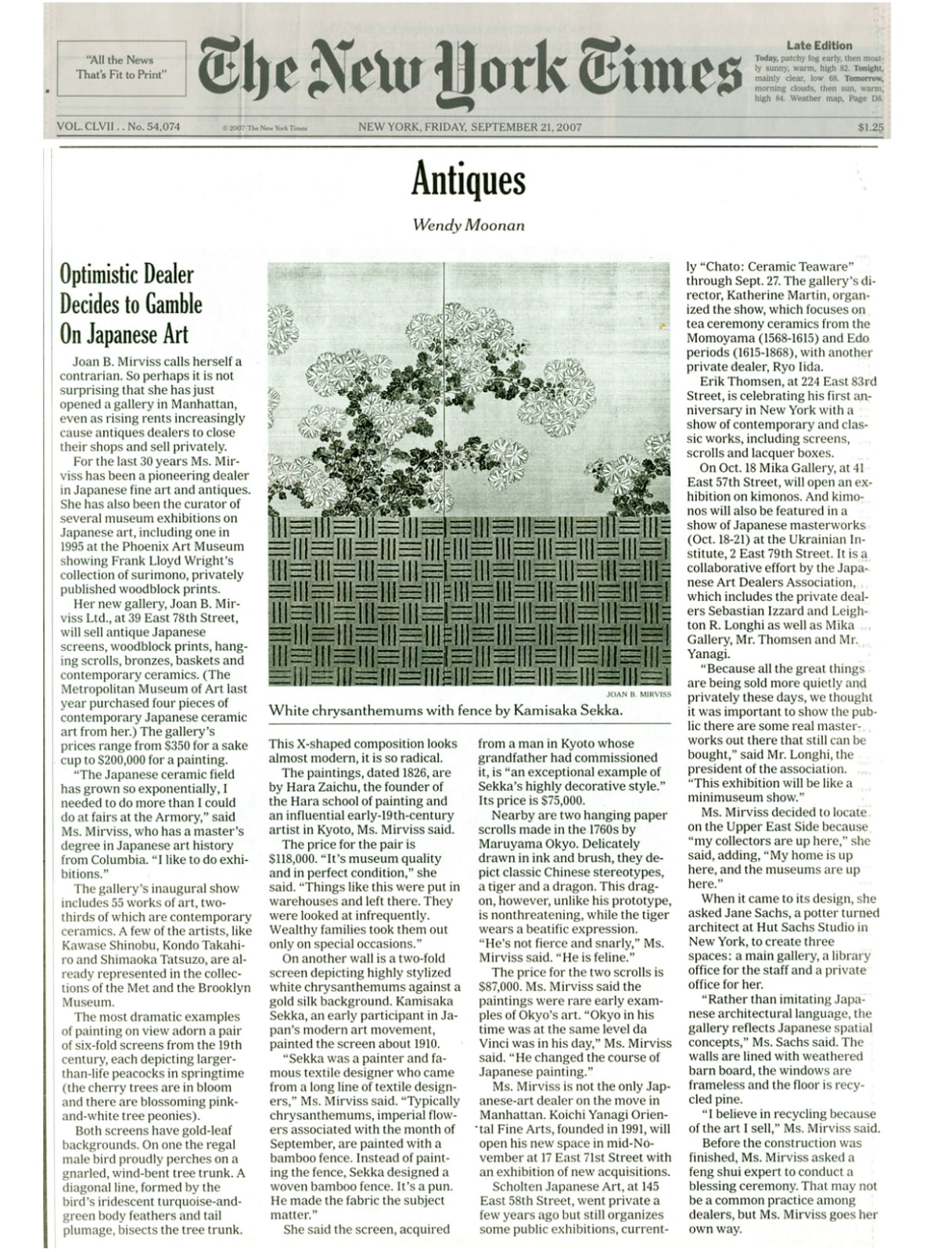 Joan B. Mirviss calls herself a contrarian. So perhaps it is not surprising that she has just opened a gallery in Manhattan, even as rising rents increasingly cause antiques dealers to close their shops and sell privately. For the last 30 years, Ms. Mirviss has been a pioneering dealer in Japanese fine art and antiques. She has also been the curator of several museum exhibitions on Japanese art, including one in 1995 at the Phoenix Art Museum showing Frank Lloyd Wright's collection of surimono, privately published woodblock prints.